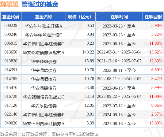 魏媛媛女士:中国国籍,硕士研究生,CFA。曾任中债资信评估有限责任公司高级分析师、嘉实基金管理有限公司信用研究员,2021年6月加入华安基金。2021年8月起,担任华安信用四季红债券型证券投资基金的基金经理。2021年12月至2025年7月7日,同时担任华安顺穗债券型证券投资基金的基金经理。2022年6月起,同时担任华安添锦债券型证券投资基金的基金经理。2022年8月起,同时担任华安添信债券型证券投资基金、华安添顺债券型证券投资基金的基金经理。2023年3月起,同时担任华安年年盈定期开放债券型证券投资基金的基金经理。2023年7月起,同时担任华安添勤债券型证券投资基金的基金经理。曾任华安乾煜债券型发起式证券投资基金的基金经理。