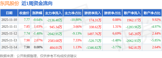 资金流向数据方面,本周东风股份主力资金合计净流出246.41万元,游资资金合计净流入143.12万元,散户资金合计净流入103.29万元。本周资金流向一览见下表: