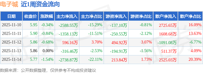 资金流向数据方面,本周电子城主力资金合计净流出6405.85万元,游资资金合计净流入126.2万元,散户资金合计净流入6279.65万元。本周资金流向一览见下表: