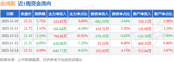 资金流向数据方面,本周金鸿顺主力资金合计净流出737.62万元,游资资金合计净流出184.4万元,散户资金合计净流入922.02万元。本周资金流向一览见下表:
