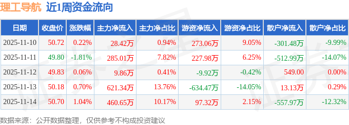 资金流向数据方面,本周理工导航主力资金合计净流入1405.29万元,游资资金合计净流出46.04万元,散户资金合计净流出1359.25万元。本周资金流向一览见下表: