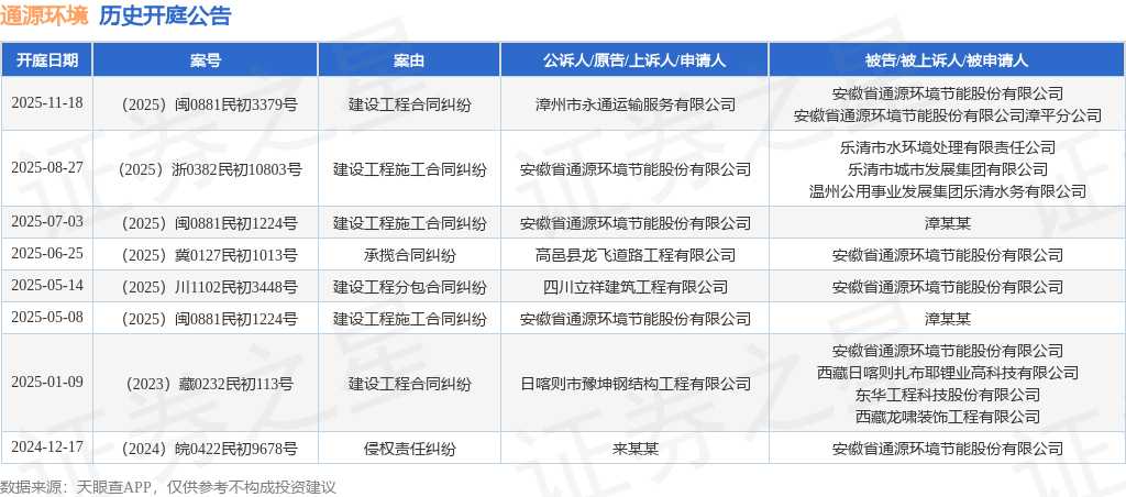 案号:(2025)闽0881民初3379号根据统计,近一年内以安徽省通源环境节能股份有限公司为当事人的历史开庭公告有8则,其中案由为“建设工程施工合同纠纷”的公告以3则居首,其次为“建设工程合同纠纷”有2则,“侵权责任纠纷”有1则。历史开庭公告如下: