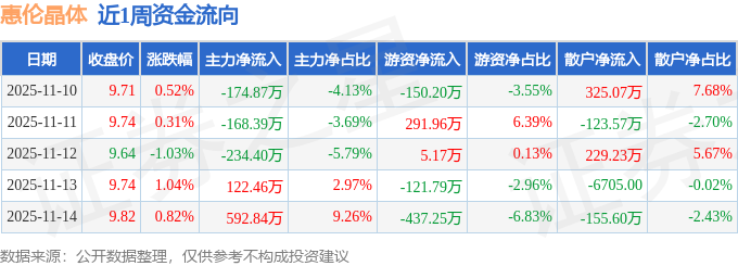 资金流向数据方面,本周惠伦晶体主力资金合计净流入137.64万元,游资资金合计净流出412.1万元,散户资金合计净流入274.46万元。本周资金流向一览见下表: