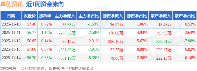 资金流向数据方面,本周卓创资讯主力资金合计净流出792.18万元,游资资金合计净流入560.7万元,散户资金合计净流入231.49万元。本周资金流向一览见下表: