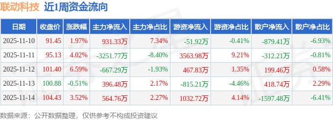 资金流向数据方面,本周联动科技主力资金合计净流出2026.49万元,游资资金合计净流入4197.39万元,散户资金合计净流出2170.9万元。本周资金流向一览见下表: