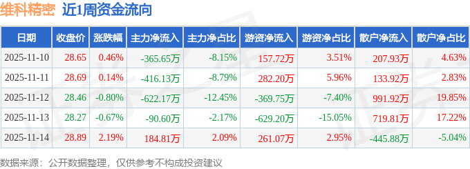 资金流向数据方面,本周维科精密主力资金合计净流出1309.73万元,游资资金合计净流出297.97万元,散户资金合计净流入1607.7万元。本周资金流向一览见下表: