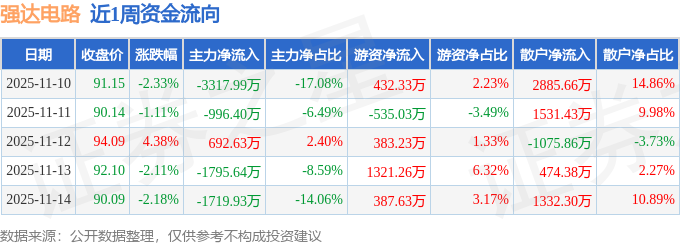 资金流向数据方面,本周强达电路主力资金合计净流出7137.31万元,游资资金合计净流入1989.42万元,散户资金合计净流入5147.9万元。本周资金流向一览见下表: