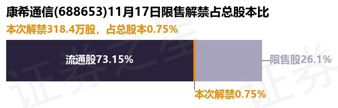 证券之星消息,根据市场公开信息整理,康希通信(688653)于11月17日将有318.4万股限售股份解禁,为公司首发战略配售股份,占公司总股本0.75%。(本次数据根据历史公告整理得出,实际情况以上市公司最新公告为准)最近一年内,该股累计解禁2.56亿股,占总股本的60.29%。本次解禁后,公司还有1.11亿股限售股份,占总股本26.1%。具体如下图所示: