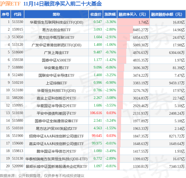 沪深ETF融资净买入前三分别为:华夏恒生互联网科技业ETF(QDII)(513330)融资净买入1.74亿元、易方达创业板ETF(159915)融资净买入8485.27万元、易方达中概互联50ETF(513050)融资净买入6854.63万元,前20具体见下表:
