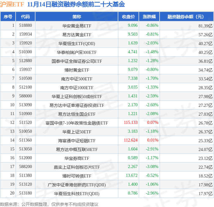 沪深ETF融资融券余额前三分别为:华安黄金易ETF(518880)融资融券余额81.39亿元、易方达黄金ETF(159934)融资融券余额57.26亿元、华夏恒生ETF(QDII)(159920)融资融券余额40.27亿元,前20具体见下表: