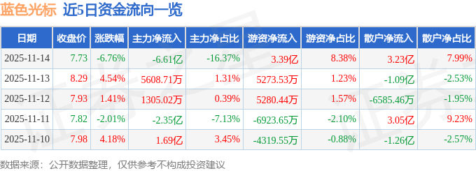 证券之星消息,截至2025年11月14日收盘,蓝色光标(300058)报收于7.73元,下跌6.76%,换手率14.63%,成交量509.11万手,成交额40.4亿元。