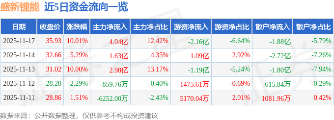 证券之星消息,盛新锂能11月17日涨停收盘,收盘价35.93元。该股于9点34分涨停,5次打开涨停,截止收盘封单资金为3.6亿元,占其流通市值1.16%。