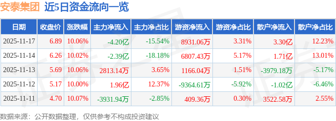 证券之星消息,截至2025年11月17日收盘,安泰集团(600408)报收于6.89元,上涨10.06%,已连续涨停5天,换手率41.06%,成交量413.39万手,成交额27.01亿元。