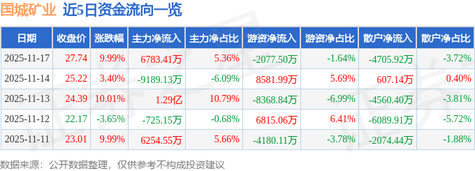 证券之星消息,国城矿业11月17日涨停收盘,收盘价27.74元。该股于9点34分涨停,2次打开涨停,截止收盘封单资金为9066.2万元,占其流通市值0.29%。