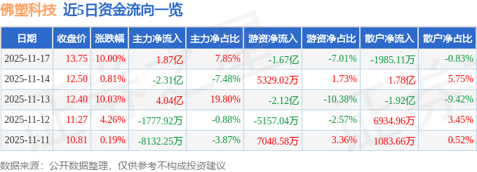 证券之星消息,佛塑科技11月17日涨停收盘,收盘价13.75元。该股于10点54分涨停,3次打开涨停,截止收盘封单资金为1474.14万元,占其流通市值0.11%。