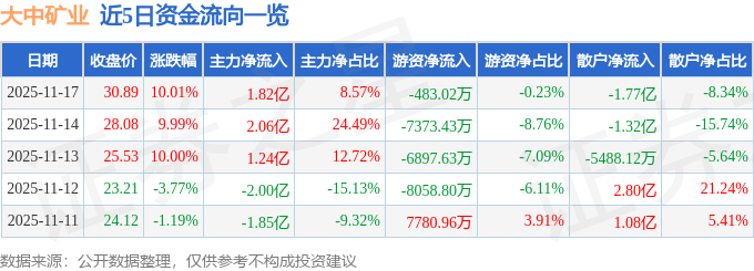 证券之星消息,大中矿业11月17日涨停收盘,收盘价30.89元。该股于9点30分涨停,4次打开涨停,截止收盘封单资金为1.26亿元,占其流通市值0.32%。