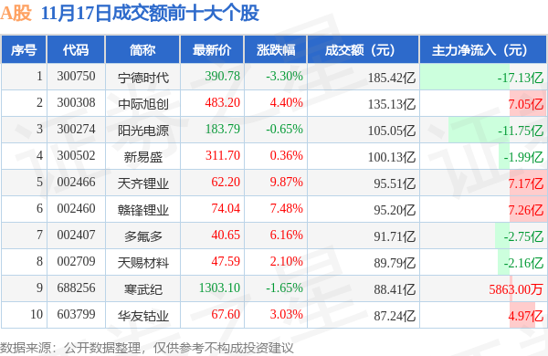当日A股成交额前10大个股中7只个股收涨,平均涨幅4.77%,其中宁德时代(300750)以成交额185.42亿元排第一。从主力资金流入看,成交额前10大个股中有5只个股呈现主力资金净流入。