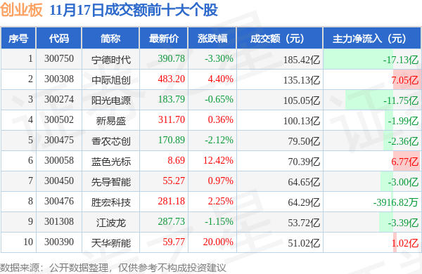 当日创业板成交额前10大个股中6只个股收涨,平均涨幅6.73%,其中宁德时代(300750)以成交额185.42亿元排第一。从主力资金流入看,成交额前10大个股中有3只个股呈现主力资金净流入。