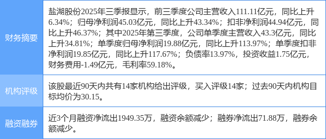 2025年8月31日,开源证券研究员金益腾,徐正凤发布了对盐湖股份的研报《公司信息更新报告:Q2业绩环比增长,4万吨锂盐项目投产在即》,该研报对盐湖股份给出“买入”评级。研报中预计公司2025-2027年归母净利润分别为52.48、57.74、61.07亿元,EPS分别为0.99、1.09、1.15元/股,当前股价对应PE为20.4、18.6、17.6倍。我们看好公司不断巩固国内氯化钾龙头、碳酸锂低成本典范的优势地位,积极融入中国五矿体系和中国盐湖,全面迈向高质量发展,维持“买入”评级。证券之星数据中心根据近三年发布的研报数据计算,该研报作者对此股的盈利预测准确度为74.27%。
