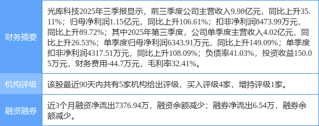 2025年10月27日,民生证券研究员马佳伟,朱正卿发布了对光库科技的研报《2025年三季度报点评:Q3业绩持续增长,光通讯业务受益AI发展》,该研报对光库科技给出“买入”评级。研报中预计公司2025~2027年营业收入有望分别达13.37亿元、17.30亿元、22.35亿元,归母净利润有望分别达1.15亿元、1.65亿元、2.24亿元,对应PE分别为244/171/125X,我们认为行业高速发展的同时公司有望凭借自身技术优势快速成长,维持“推荐”评级。证券之星数据中心根据近三年发布的研报数据计算,该研报作者对此股的盈利预测准确度为29.56%。