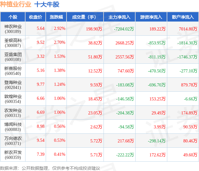 个股表现方面,种植业行业当日领涨股为神农种业(300189),该股当日报收5.64,上涨2.92%,成交量198.9万,主力资金净流出7204.02万元。荃银高科(300087)以上涨2.7%紧随其后,该股当日成交量38.82万,主力资金净流入2668.25万元。除此之外,亚盛集团(600108)、新赛股份(600540)、登海种业(002041)均进入当日牛股之列。具体个股列表见下表: