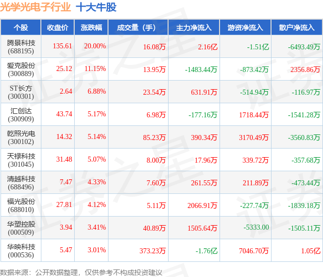 个股表现方面,光学光电子行业当日领涨股为腾景科技(688195),该股当日报收135.61,上涨20.0%,成交量16.08万,主力资金净流入2.16亿元。爱克股份(300889)以上涨11.15%紧随其后,该股当日成交量13.95万,主力资金净流出1483.44万元。除此之外,ST长方(300301)、汇创达(300909)、乾照光电(300102)均进入当日牛股之列。具体个股列表见下表: