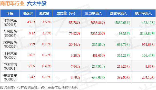 个股表现方面,商用车行业当日领涨股为江淮汽车(600418),该股当日报收49.62,上涨3.66%,成交量55.78万,主力资金净流入5933.86万元。东风股份(600006)以上涨2.78%紧随其后,该股当日成交量79.92万,主力资金净流入5237.2万元。除此之外,曙光股份(600303)、江铃汽车(000550)、中国重汽(000951)均进入当日牛股之列。具体个股列表见下表: