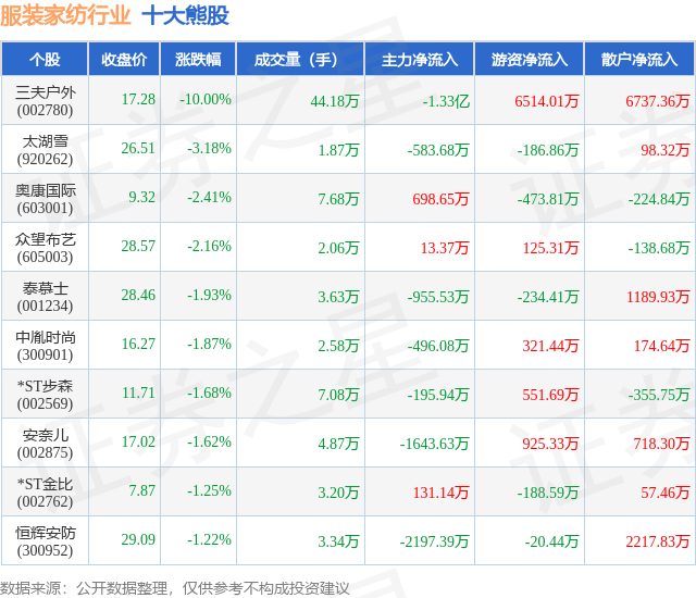 个股表现方面,服装家纺行业当日领跌股为三夫户外(002780),该股当日报收17.28,下跌10.0%,成交量44.18万,主力资金净流出1.33亿元。太湖雪(920262)以下跌3.18%紧随其后,该股当日成交量1.87万,主力资金净流出583.68万元。除此之外,奥康国际(603001)、众望布艺(605003)、泰慕士(001234)均进入当日熊股之列。具体个股列表见下表: