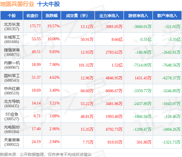 个股表现方面,地面兵装行业当日领涨股为北方长龙(301357),该股当日报收175.77,上涨19.57%,成交量13.12万,主力资金净流入3981.05万元。长城军工(601606)以上涨10.0%紧随其后,该股当日成交量50.91万,主力资金净流入8.66亿元。除此之外,捷强装备(300875)、内蒙一机(600967)、国科军工(688543)均进入当日牛股之列。具体个股列表见下表: