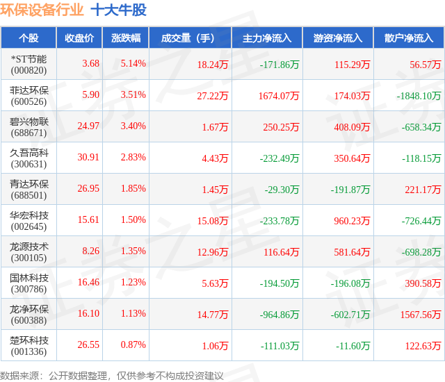 个股表现方面,环保设备行业当日领涨股为*ST节能(000820),该股当日报收3.68,上涨5.14%,成交量18.24万,主力资金净流出171.86万元。菲达环保(600526)以上涨3.51%紧随其后,该股当日成交量27.22万,主力资金净流入1674.07万元。除此之外,碧兴物联(688671)、久吾高科(300631)、青达环保(688501)均进入当日牛股之列。具体个股列表见下表: