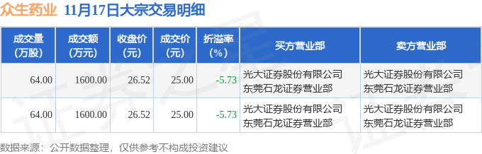 证券之星消息,11月17日众生药业发生大宗交易,交易数据如下: