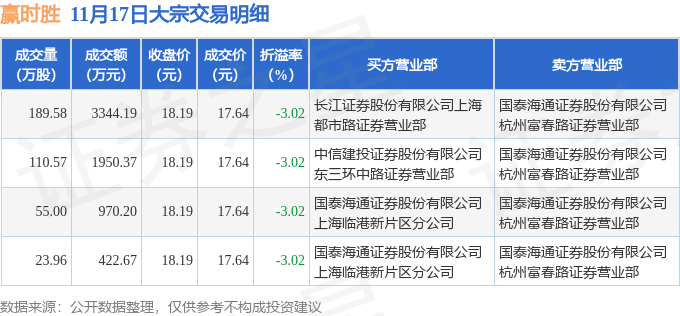 证券之星消息,11月17日赢时胜发生大宗交易,交易数据如下: