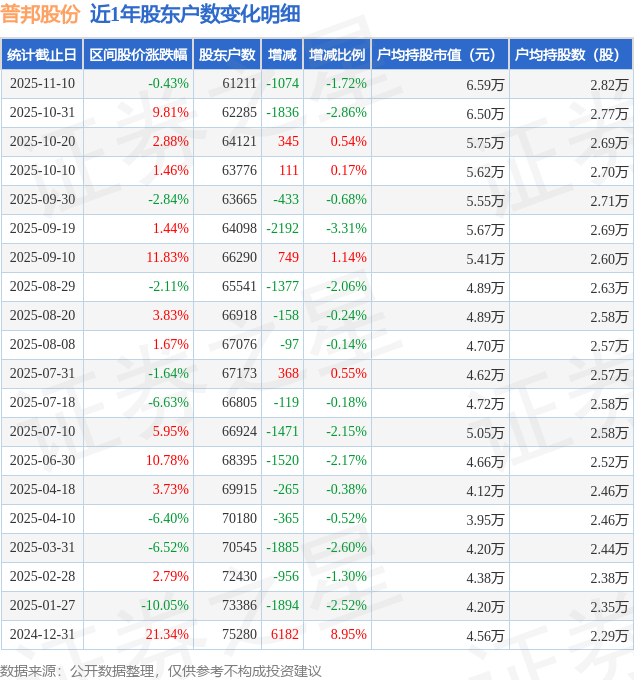 从股价来看,2025年10月31日至2025年11月10日,普邦股份区间跌幅为0.43%,在此期间股东户数减少1074.0户,减幅为1.72%。