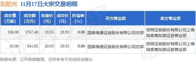证券之星消息,11月17日东阳光发生大宗交易,交易数据如下: