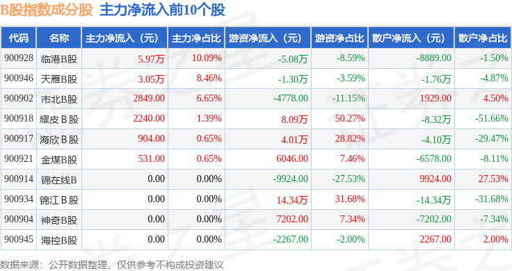 资金流向方面,B股指数(000003)成份股当日主力资金净流出合计18.46万元,游资资金净流出合计9.54万元,散户资金净流入合计28.0万元。成份股资金流向详情见下表: