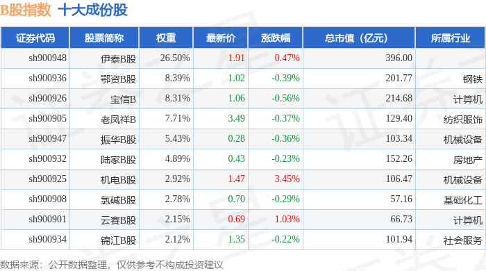 证券之星消息,11月17日,B股指数(000003)报收于256.95点,跌0.05%,成交9004.24万元,换手率0.14%。当日该指数成份股中,上涨的有11家,机电B股以3.45%的涨幅领涨,下跌的有28家,海立B股以4.18%的跌幅领跌。