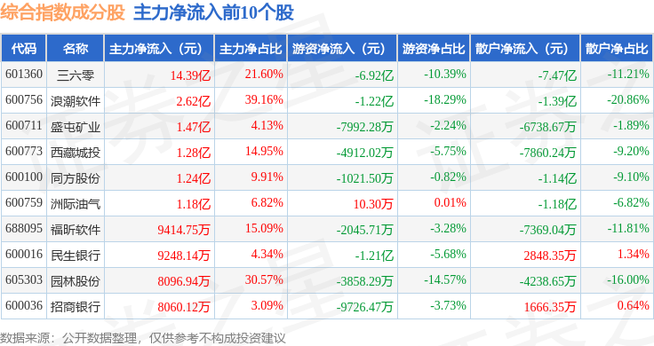 资金流向方面,综合指数(000008)成份股当日主力资金净流出合计26.51亿元,游资资金净流入合计7.28亿元,散户资金净流入合计19.23亿元。成份股资金流向详情见下表: