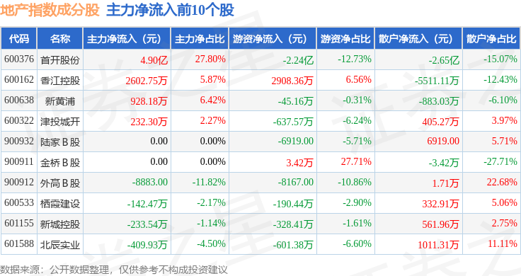 资金流向方面,地产指数(000006)成份股当日主力资金净流入合计7014.34万元,游资资金净流出合计2698.75万元,散户资金净流出合计4315.59万元。成份股资金流向详情见下表: