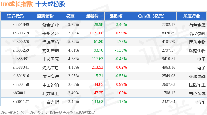 证券之星消息,11月17日,180成长(000028)指数报收于3832.84点,跌0.91%,成交960.45亿元,换手率0.87%。当日该指数成份股中,上涨的有18家,华友钴业以3.03%的涨幅领涨,下跌的有40家,拓荆科技以5.72%的跌幅领跌。