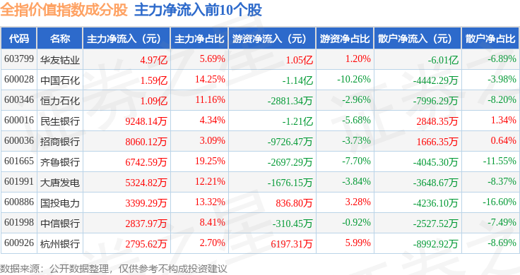 资金流向方面,全指价值(000058)指数成份股当日主力资金净流出合计62.61亿元,游资资金净流入合计21.74亿元,散户资金净流入合计40.87亿元。成份股资金流向详情见下表: