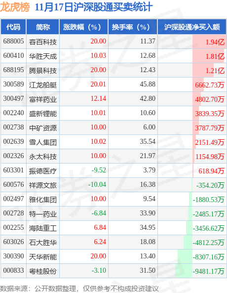 龙虎榜中有沪股通/深股通专用席位(北向资金)现身的个股共17家,其中容百科技以净买入1.94亿元排名第一。详情见下表: