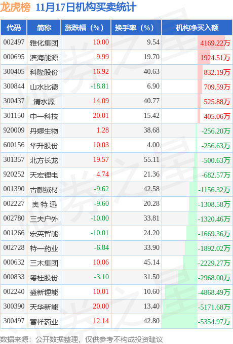 当日公布的交易所龙虎榜中有机构专用席位现身的个股共24家,其中雅化集团以净买入4169.22万元排名第一。详情见下表: