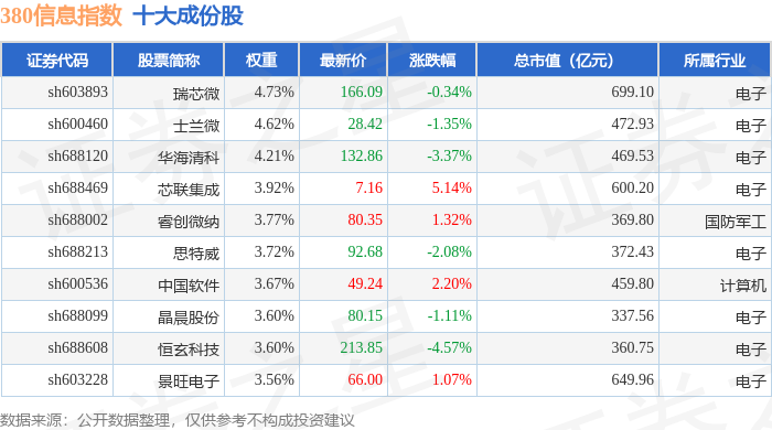 证券之星消息,11月17日,380信息(000111)指数报收于9315.3点,涨0.0%,成交198.46亿元,换手率1.81%。当日该指数成份股中,上涨的有23家,芯联集成以5.14%的涨幅领涨,下跌的有22家,恒玄科技以4.57%的跌幅领跌。