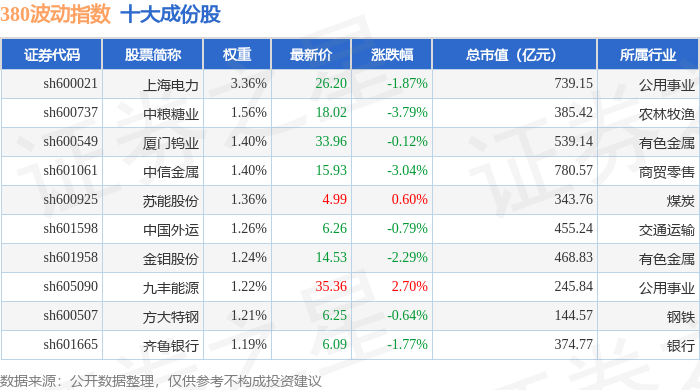 380波动(000130)指数十大成份股详情如下: