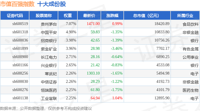 市值百强(000155)指数十大成份股详情如下: