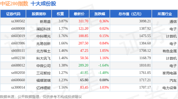 证券之星消息,11月17日,中证200(000904)指数报收于5559.98点,跌0.3%,成交2338.11亿元,换手率1.18%。当日该指数成份股中,上涨的有63家,三六零以10.01%的涨幅领涨,下跌的有134家,康龙化成以5.34%的跌幅领跌。