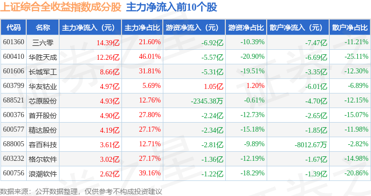资金流向方面,上证综合全收益(000888)指数成份股当日主力资金净流出合计209.9亿元,游资资金净流入合计24.0亿元,散户资金净流入合计185.9亿元。成份股资金流向详情见下表: