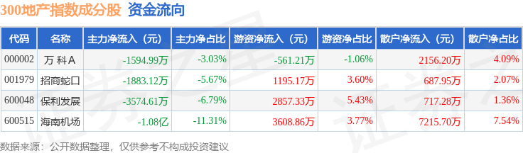 资金流向方面,300地产(000952)指数成份股当日主力资金净流出合计1.79亿元,游资资金净流入合计7100.14万元,散户资金净流入合计1.08亿元。成份股资金流向详情见下表: