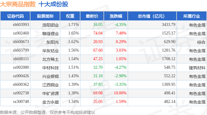 证券之星消息,11月17日,大宗商品(000979)指数报收于6615.78点,涨0.19%,成交1244.27亿元,换手率0.99%。当日该指数成份股中,上涨的有43家,中矿资源以10.0%的涨幅领涨,下跌的有55家,洛阳钼业以4.35%的跌幅领跌。