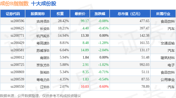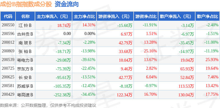 资金流向方面,成份B指(399003)指数成份股当日主力资金净流出合计565.12万元,游资资金净流入合计244.26万元,散户资金净流入合计320.86万元。成份股资金流向详情见下表: